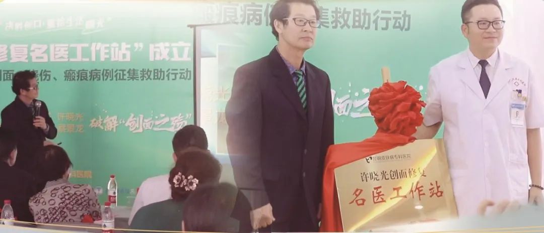 “蔡景龙名医疤痕治疗工作室——昆明分中心”成立仪式现场;蔡景龙教授在疤痕名医工作站会诊患者。