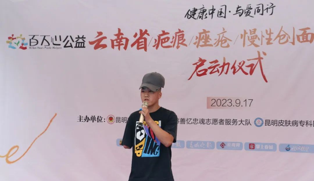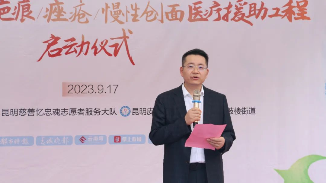 为进一步织密民众皮肤健康保障网、以多领域、贴心化、定制化的社区服务,把关爱皮肤病患者公益行动更加具体化、落地化,9月17日上午,百万心公益 | 云南省疤痕/痤疮/慢性创面医疗援助工程第一站社区启动仪式及专病义诊开诊仪式在盘龙区鼓楼街道桃源社区举行。盘龙区鼓楼街道交三桥社区书记王涛、昆明慈善忆忠魂志愿者服务大队队长周弋戈、副队长王云鹏、昆明皮肤病专科医院侯建凯院长、专家门诊吴潞明教授、百万心公益首例援助患者全国残运杨玉帅等人出席了议程。