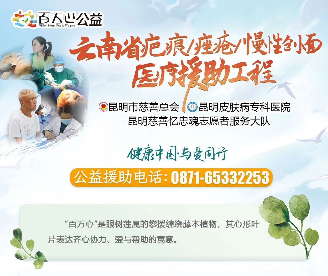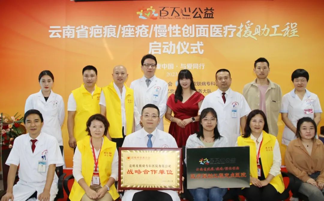 随着8月4日百万心公益|云南省疤痕/痤疮/慢性创面医疗援助工程启动,在昆明市慈善总会的带领下,依托昆明慈善忆忠魂志愿服务大队为代表的社会力量,我院充分发挥现有专家、技术资源优势,履行主体单位职能,面对社会疤痕、痤疮、慢性创面群体,以实际行动,践行社会公益。
