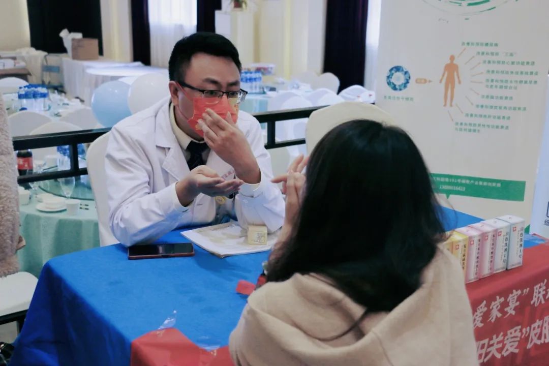 与此同时,为加强老年人的防病意识,关爱老人健康,现场还开展了健康宣教、急救演练、现场义诊、送医送药等活动。我院门诊医生任方钊为在座的老年群体进行现场义诊,宣教皮肤疾病防治知识,并为他们送出了本院内制剂:老年患者应对常见皮肤病的家庭常备药物。