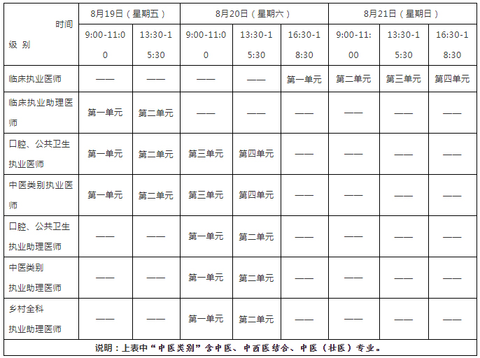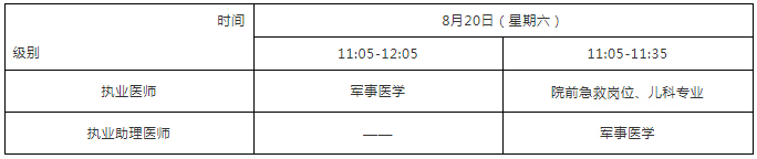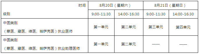 考试实行计算机化考试,军队现役人员加试军事医学、院前急救岗位和儿科专业加试相应内容。中医类别蒙医、藏医、维医、哈萨克医专业实行纸笔考试。统一考试时间如下: